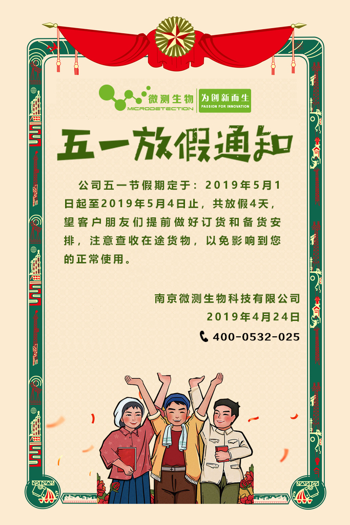 公司五一勞動節(jié)假期定于:2019年5月1日起至2019年5月4日止,共放假4天,望客戶朋友們提前做好訂貨和備貨安排,注意查收在途貨物,以免影響到您的正常使用。