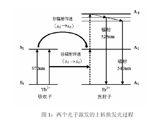 自然界中存在很多有機或無機物質(zhì),它們可以在電磁輻射激發(fā)下發(fā)射熒光或磷光,且在發(fā)光過程中遵守Stokes 規(guī)則,即發(fā)射光的波長長于激發(fā)光的波長。而在20 世紀70 年代,科學家們卻合成了一類可以反Stokes 規(guī)則產(chǎn)生磷光的特殊材料,即UCP。UCP 在紅外光區(qū)(波長>780nm)被激發(fā),卻可以發(fā)射波長遠短于激發(fā)光的可見光(波長475nm-670nm),即能量上轉(zhuǎn)換。物質(zhì)構(gòu)成決定性質(zhì)特點。UCP 是由稀土金屬元素摻雜于晶體的晶格中構(gòu)成的。在這種材料中有三種主要的成分:主基質(zhì)(Host Matrix)、吸收子(Absorber)和發(fā)射子(Emitter)。作為主基質(zhì)的晶體材料有:氧硫化物(如Y2O2S、GdO2S、La2O2S 等)、氟化物(如YF3、GdF3、LaF3 等)、鎵酸鹽(如YGaO3、Y3Ga5O12 等)以及硅酸鹽(如YSi2O5、YSi3O7 等)等;常用作吸收子的稀土金屬離子有:鐿離子(Yb3+)、鉺離子(Er3+)、釤離子(Sm3+)等;常用作發(fā)射子的稀土金屬離子有:鉺離子(Er3+)、鈥離子(Ho3+)、銩離子(Tm3+)、鋱離子(Tb3+)等。吸收子和發(fā)射子這一離子對在主基質(zhì)晶格內(nèi)適宜的空間取向和距離,是產(chǎn)生上轉(zhuǎn)換發(fā)光的基礎(chǔ)。上轉(zhuǎn)換發(fā)光的產(chǎn)生是一個涉及多個(至少兩個)光子的光學過程。在這個過程中(如圖1),UCP 內(nèi)的吸收子(如Yb3+)至少要吸收兩個低能量光子(紅外光區(qū),如970nm),而后經(jīng)過一系列內(nèi)部能量轉(zhuǎn)換,以非輻射的形式(A1→A2,A2→A3)將這兩個光子的能量連續(xù)傳遞給發(fā)射子(如Er3+),以使其處于激發(fā)態(tài)(A3)。后者接著發(fā)生一個返回基態(tài)能級的躍遷,釋放一個高能光子(可見光區(qū),如525nm 或540nm),完成能量上轉(zhuǎn)換。